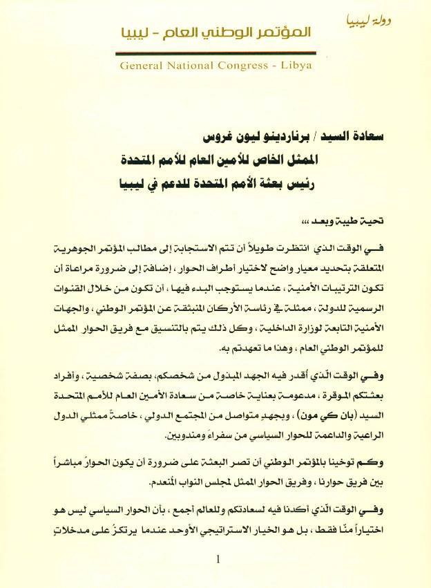 وأضافت الرسالة التي أرسلها بوسهمين إلى ليون، أن هناك اعتراضا من بعض الأعضاء في المؤتمر على الحوار، وهناك من يرفض مخرجات الحوار، وبعض الأعضاء على استعداد للشروع في طرح أسماء لحكومة الوفاق شرط تضمين التعديلات .