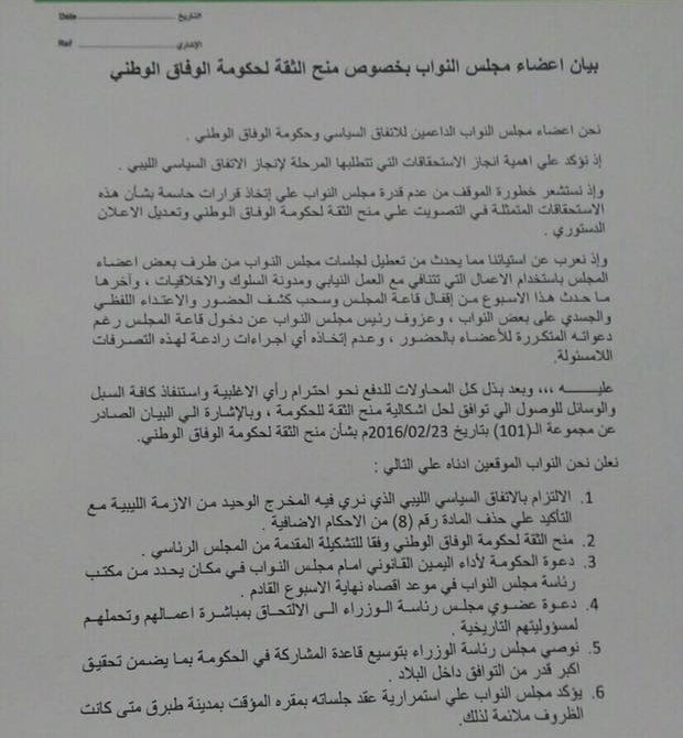 وأوصى النواب المؤيدون لمنح الثقة لحكومة الوفاق الوطني في بيانهم مجلس رئاسة الوزراء بتوسيع قاعدة المشاركة في الحكومة بما يضمن تحقيق أكبر قدر من التوافق داخل البلاد، مؤكدين الالتزام بالاتفاق السياسي الليبي مع التأكيد على حذف المادة رقم ثمانية من الأحكام الإضافي.