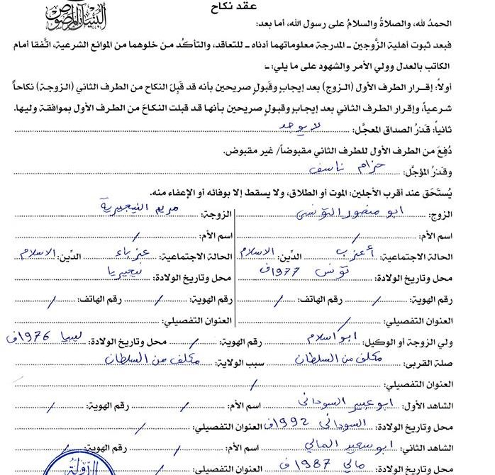 نشر المركز الإعلامي لغرفة البنيان المرصوص وثائق جديدة خاصة بتنظيم داعش في سرت، وهي عبارة عن “عقود زواج” معتمدة من قاضي “محكمة الأحوال الشخصية”.