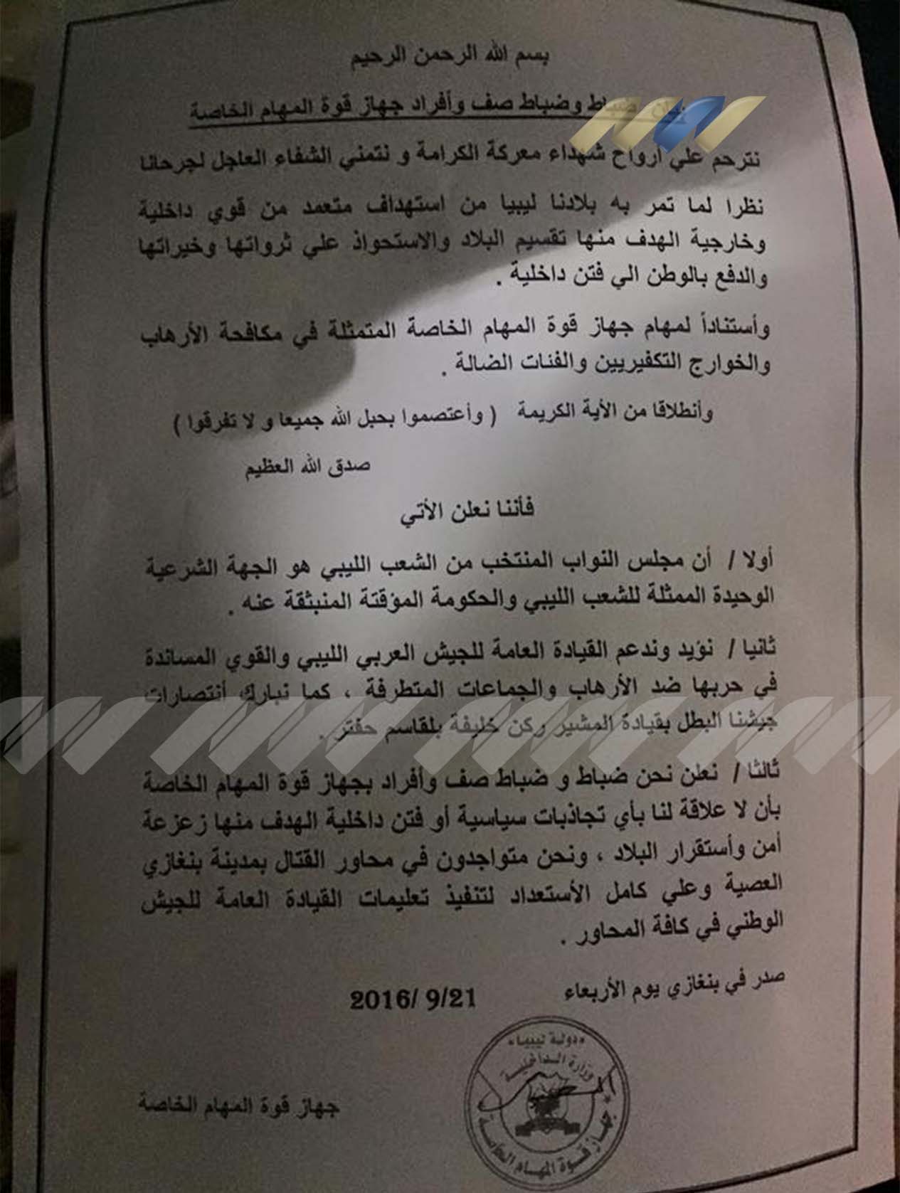ثالثا/ نعلن ضباط صف وأفراد بجهاز قوة المهام الخاصة بأن لا علاقة لنا بأي تجاذبات سياسية أو فتن داخلية الهدف منها زعزعة أمن وأستقرار البلاد، ونحن متواجدون في محاور القتال بمدينة بنغازي العصية وعلى كامل الاستعداد لتنفيذ تعليمات القيادة العامة للجيش الوطني في كافة المحاور