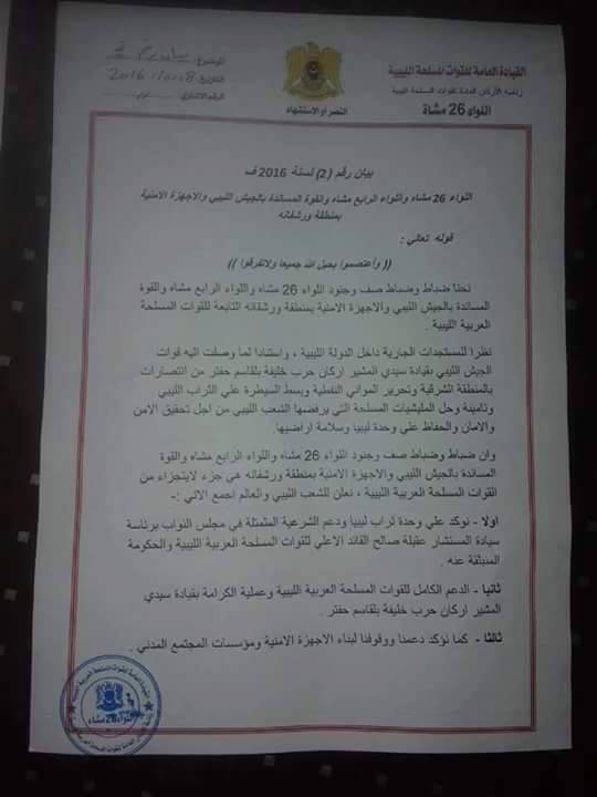 أصدر ضباط وضباط الصف وجنود اللواء 26 مشاة، واللواء الرابع مشاة، والقوة المساندة للجيش الليبي والأجهزة الأمنية بمنطقة ورشفانة التابعة للقوات المسلحة الليبية بيانا أكدوا فيه على وحدة التراب الليبي ودعم الشرعية المتمثلة في مجلس النواب برئاسة المستشار عقيلة صالح القائد الأعلى للقوات المسلحة العربية الليبية والحكومة المنبثقة عنه، مبدين دعمهم الكامل للقوات المسلحة الليبية وعملية الكرامة بقيادة المشير أركان حرب خليفة بلقاسم حفتر إلى جانب دعمهم ووقوفهم لبناء الأجهزة الأمنية ومؤسسات المجتمع المدني مؤكدين على ضرورة أن يكون الحل ليبيا ليبيا داخل الأراضي الليبية.