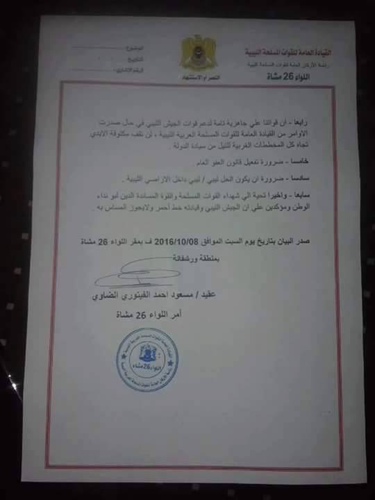 اللواء 26 واللواء الرابع والقوة المساندة للجيش يؤكدون على وحدة التراب الليبي ودعم الشرعية