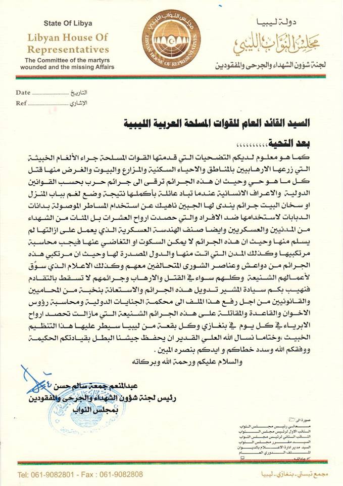 خاطبت لجنة شؤون الشهداء والجرحى والمفقودين بمجلس النواب في بيان أصدرته اليوم خاطبت القائد العام للقوات المسلحة المشير خليفة حفتر بشأن تدويل جرائم الارهابيين المرتكبة في بنغازي وعموم ليبيا والتي يقف وراءها تنظيمات الإخوان والقاعدة والمقاتلة ، مطالبة برفع ملف الجرائم إلى محكمة الجنايات الدولية والإستعانة بنخب من المحامين والقانونيين.