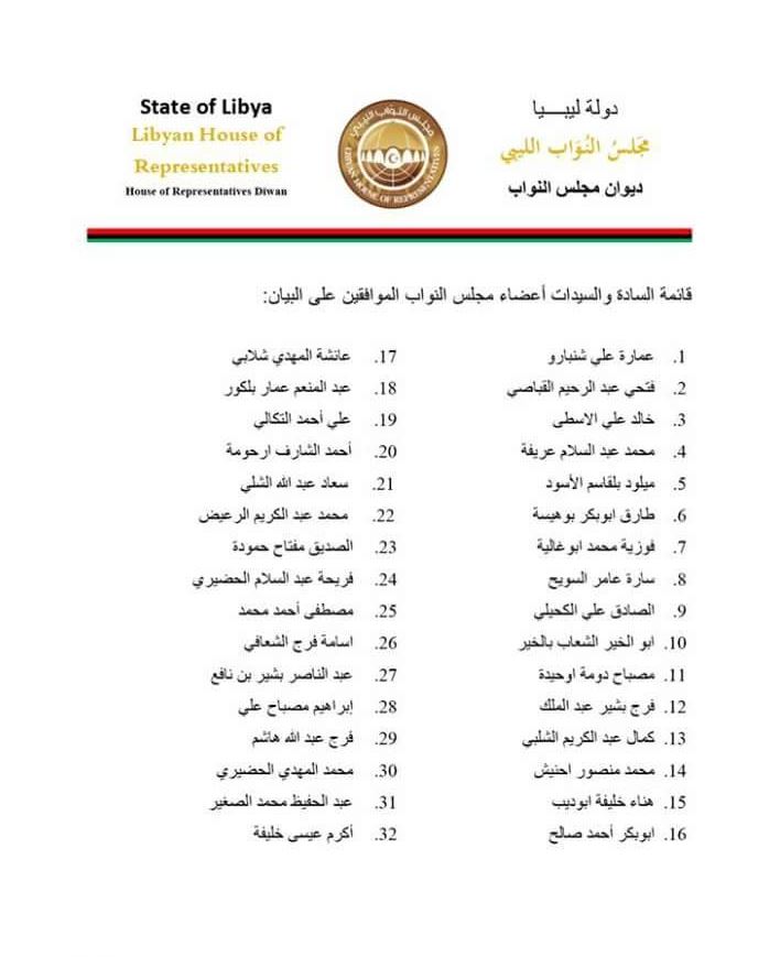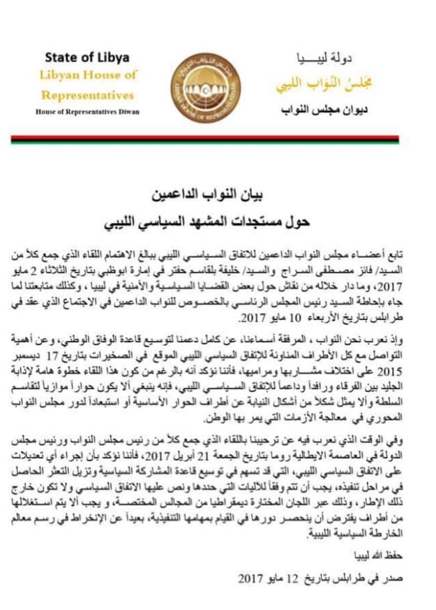 وأضاف النواب في بيان أصدروه أمس أن مثل هذه اللقاءات من المفترض ألا يكون فيها الحوار موازيا لتقاسم السلطة وألا يمثل شكلا من أشكال النيابة عن أطراف الحوار الأساسية أو استبعاد الدور المحوري لمجلس النواب في معالجة الأزمة، مؤكدين على أن إجراء أي تعديل على الاتفاق السياسي يجب أن يكون وفقا لما نص عليه الاتفاق، بحسب نص البيان.