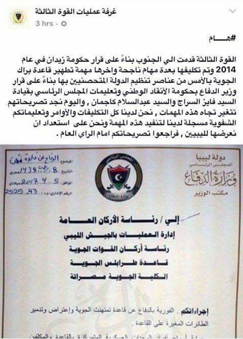 وأكدت القوة أنها تلقت التعليمات الأخيرة بالهجوم على قاعدة براك الجوية بناء على قرار من وزير الدفاع المفوض بحكومة الوفاق، وتعليمات رئيس المجلس الرئاسي فايز السراج وعضو المجلس عبد السلام كاجمان، مرفقة في منشورها صورة من قرار صادر عن وزير الدفاع المفوض المهدي البرغثي يطالب فيه بالدفاع عن قاعدة تمنهنت الجوية.