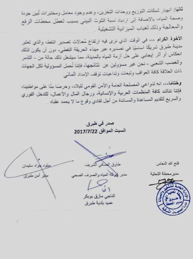 وألقي بيان الأهالي بحضور الجهات ذات العلاقة، ومنها محطة تحلية مياه البحر بطبرق، والشركة العامة للمياه والصرف الصحي، وعميد بلدية طبرق ومدير أمن طبرق، ومدير مركز الخبرة القضائية والبحوث بالمدينة.