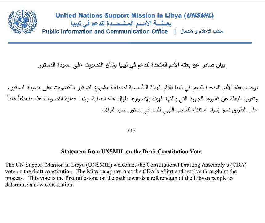 رحبت بعثة الأمم المتحدة للدعم في ليبيا بقيام الهيئة التأسيسية لصياغة مشروع الدستور بالتصويت على مسودة الدستور.