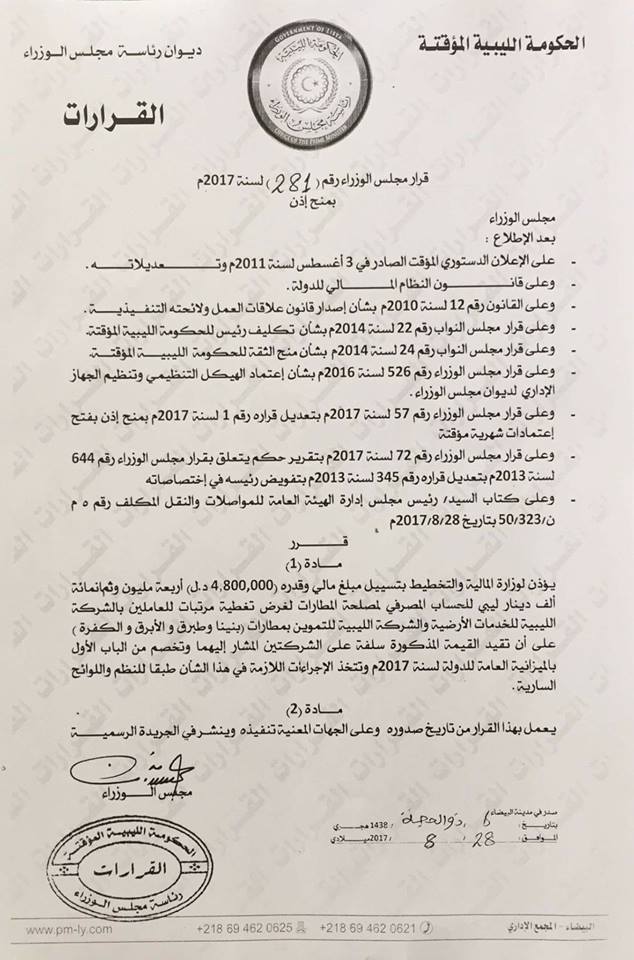 أذن مجلس وزراء الحكومة المؤقتة برئاسة عبدالله الثني اليوم لوزارة المالية والتخطيط بتسييل أربعة ملايين وثمانيمئة ألف دينار ليبي للحساب المصرفي لمصلحة المطارات، لغرض تغطية مرتبات العاملين بالشركة الليبية للخدمات الأرضية والشركة الليبية للتموين بمطارات بنينا، وطبرق، والأبرق، والكفرة.
