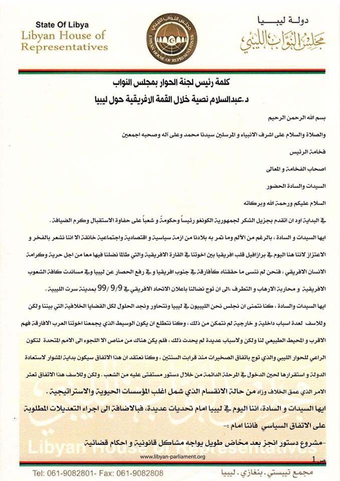 وأكد نصية خلال كلمته في اجتماع برازافيل، أن ليبيا تمر بتحديات عديدة تضاف إلى إجراء التعديلات على الاتفاق السياسي، أهمها مشروع الدستور والذي يواجه مشاكل قانونية وأحكاما قضائية، والرغبة الكبيرة في إنهاء المراحل الانتقالية، والدخول في مرحلة دائمة عن طريق إجراء انتخابات رئاسية وبرلمانية، بالإضافة إلى تسليح الجيش الوطني، والمصالحة الوطنية الشاملة، وعودة كل المهجرين والنازحين.