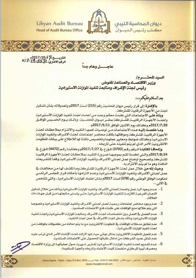 طالب ديوان المحاسبة في طرابلس بوقف إصدار أي موافقات على طلبات فتح الاعتمادات المستندية من قبل لجنة تنفيذ الموازنة الاستيرادية، وكذلك عدم إحالة أي موافقات صادرة إلى مصرف ليبيا المركزي أو المصارف التجارية إلا بعد معالجة وتصحيح أوضاع لجنتي الإشراف وتنفيذ الموازنة الاستيرادية، وذلك بناء على مخالفات نشرها الديوان في بيان رسمي.