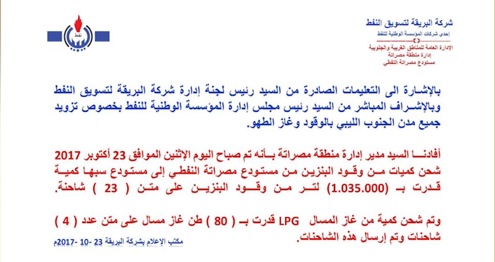 أعلنت منطقة مصراتة بشركة البريقة لتسويق النفط عن توجه ثلاث وعشرين شاحنة إلى مستودع سبها النفطي محملة بنحو مليون وخمسة وثلاثين ألف لتر من البنزين.