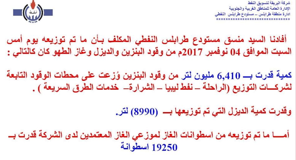 أعلنت شركة البريقة لتسويق النفط اليوم توزيع كميات من وقود البنزين والديزل وغاز الطهي من مستودع طرابلس النفطي يوم أمس .