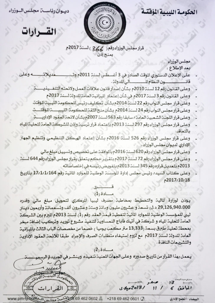 وجاء في بيان حصلت “قناة ليبيا” على نسخة منه أن الحكومة الموقتة أذنت إلى وزارة المالية بمخاطبة المركزي، من أجل تحويل تسعة وعشرين مليونا ومئة وستة وعشرين ألفا وتسعمئة وأربعين دينارا لصالح المؤسسة الوطنية للموارد المائية، لتغطية قيمة عقد المشروع الذي حمل رقم واحد للعام ألفين وثلاثة عشر، المبرم بين الشركة العامة لتحلية المياه وشركة ﭬي آتيك» النمساوية، لتوريد وتركيب مبخر لمحطة تحلية طبرق.