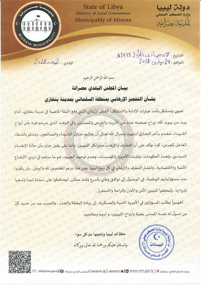دان المجلس البلدي مصراتة التفجيرين الانتحاريين اللذين وقعا مساء أمس بالسلماني واللذين خلفا عددا كبيرا من الضحايا .