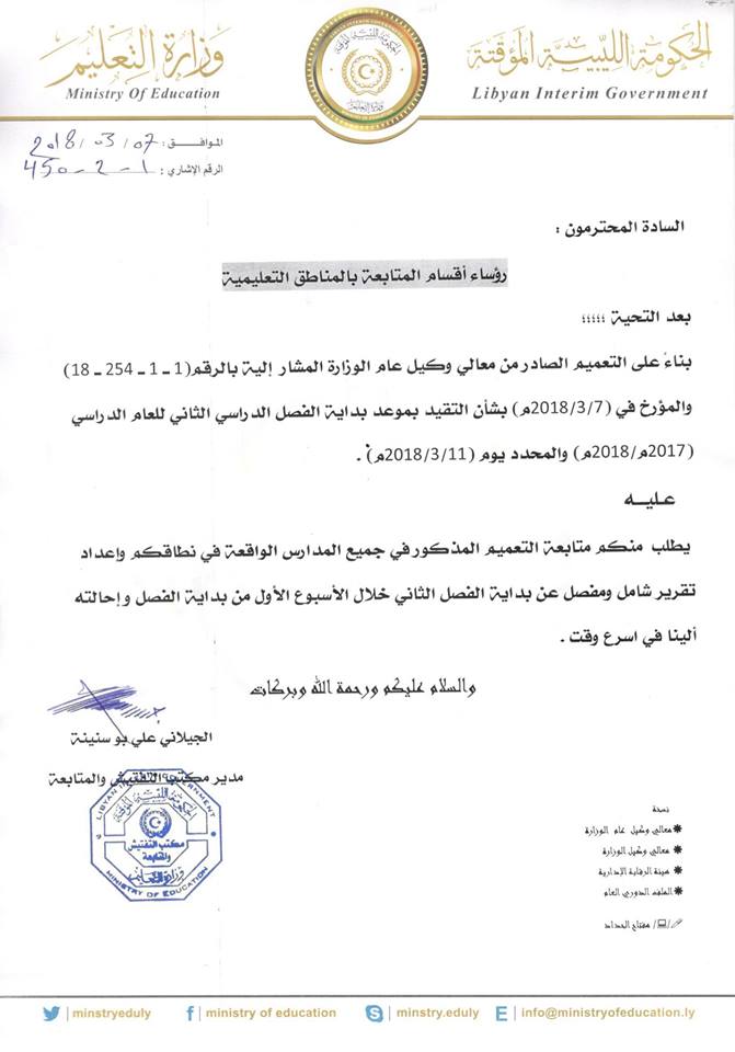 وجهت وزارة التعليم بالحكومة المؤقتة خطابا اليوم، إلى رؤساء أقسام المتابعة بالمناطق التعليمية، بشأن التقيد بموعد بداية الفصل الدراسي الثاني للعام الجاري، والمحدد يوم الأحد القادم.