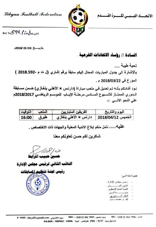 أكدت لجنة تنظيم المسابقات بالاتحاد الليبي لكرة القدم، تغيير مكان مباراة دارنس والأهلي بنغازي.