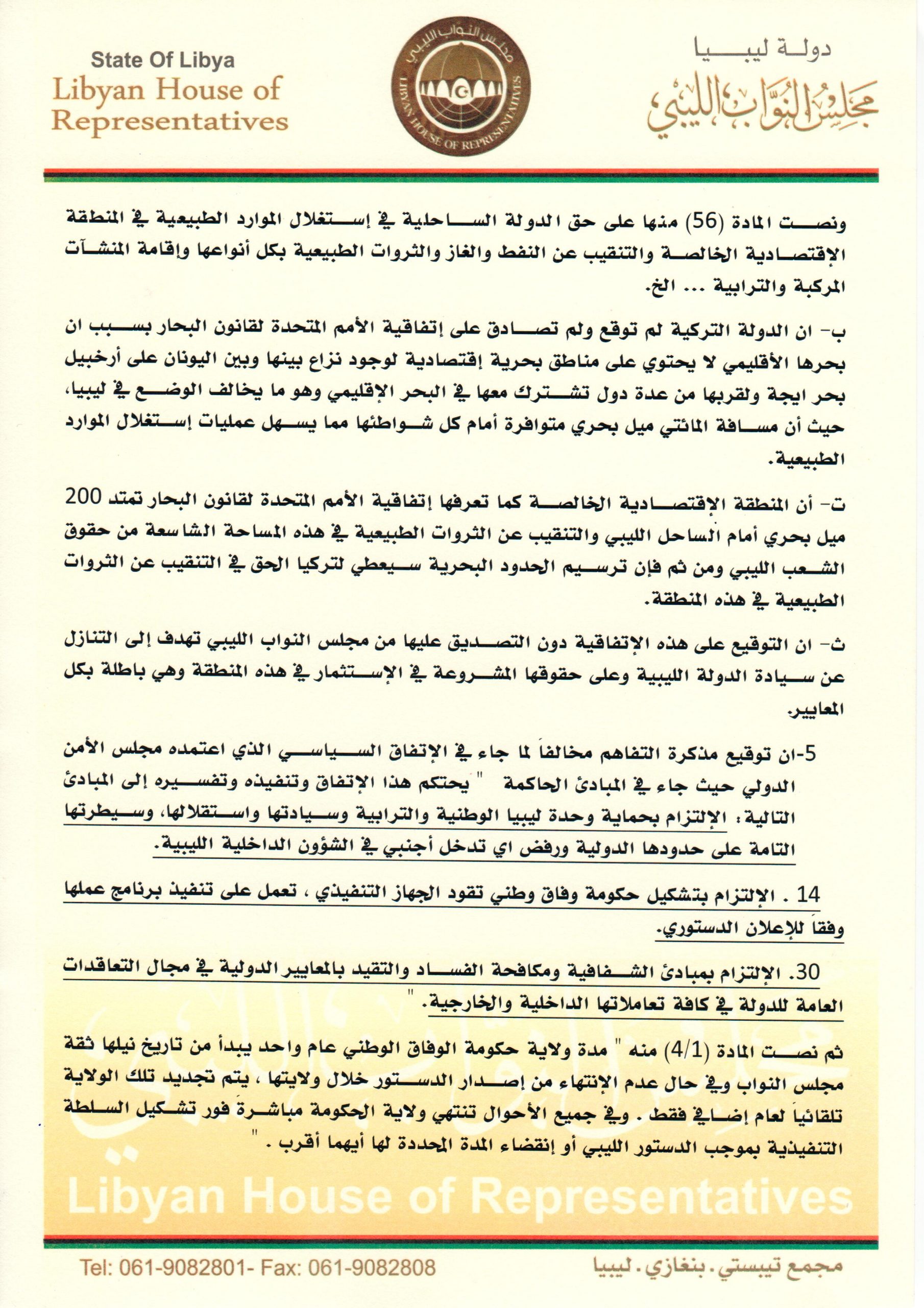 وبحسب الخطاب أن حكومة الوفاق درجت على عقد اتفاقيات مع بعض الدول تحت مسمى مذكرات تفاهم لغرض الهروب من تصديق مجلس النواب عليها.