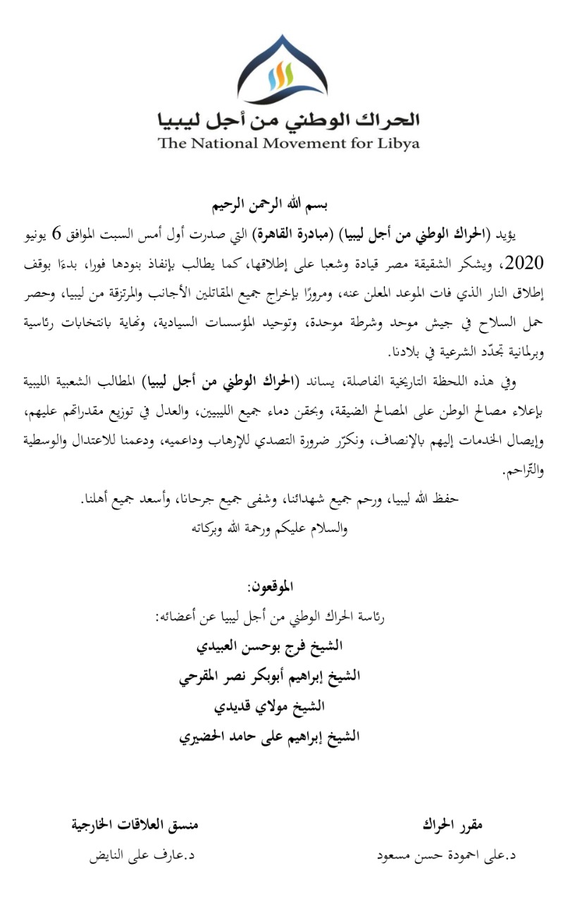 أيد الحراك الوطني من أجل ليبيا مبادرة القاهرة الصادرة السبت الماضي، مطالبين بإنفاذ بنودها بدءا بوقف إطلاق النار الذي فات الموعد المعلن عنه.