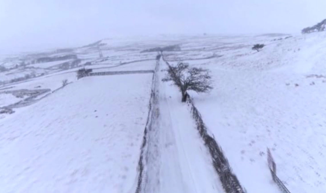 أظهرت لقطات فيديو من طائرة بدون طيار المعروفة بالدرون، سماكة الثلوج التي غطت الجبال والحقول والمناظر الطبيعية لوادي يوركشاير في شمال إنجلترا.