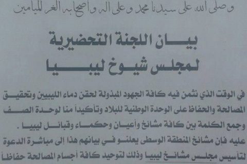 مشائخ وأعيان وحكماء المنطقة الوسطى يدعون إلى تأسيس مجلس شيوخ ليبيا لدعم وحدة الصف