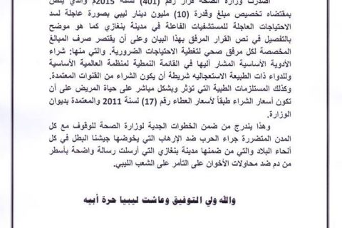 وزارة الصحة تخصص 10 ملايين دينار لمستشفيات بنغازي